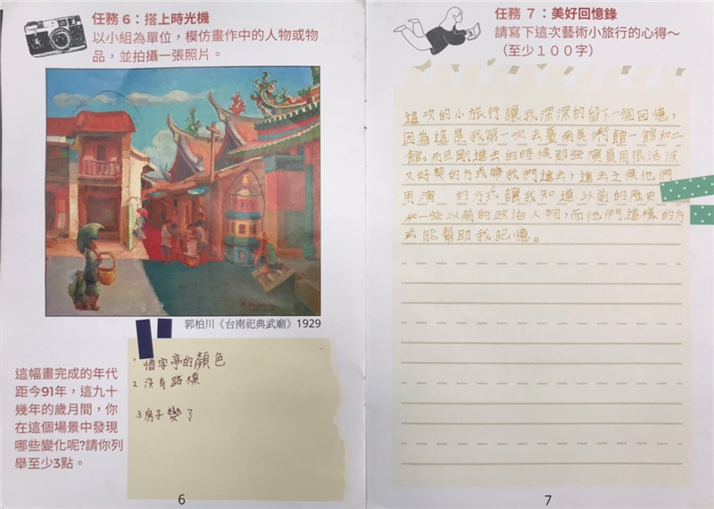 「藝起來尋美」南薰藝韻--府城之美(108) 我要媒合 友善列印 追蹤 評價 評價: 目前尚未評價 | 0則評價 課程簡介 一、台南美術二館設置「藝術家專室」,首檔展覽《南薰藝韻》介紹了郭柏川、沈哲哉及許武勇等三位跟台南頗有淵源的藝術家,藉由帶領學生認識藝術家的生平跟畫作,讓學生更了解台南這個富含豐富文化底蘊的城市。 二、配合四年級社會課「家鄉的名勝古蹟」這一單元,再透過藝術家的畫作深入認識府城幾個別具特色的名勝古蹟,除了課堂上的解說與美術館的體驗之外,並讓學生實地踏查這些地點,透過解決任務的方式,將書本上看的這些文字及圖像用身體記憶下來。 課程資訊 教學節數 20 適合年級 國小中年級 課程地點 學校、台南美術館二館、全台首學、祀典武廟 場館名稱 台南美術館二館 課程類別 視覺藝術類 、 音樂及表演藝術類 體驗課程教案 藝起來尋美第二期教案--新市國小X台南美術館.pdf .PDF 申請期間 2021/04/09~2021/04/26 主辦單位 市立新市國小 教案編輯團隊 吳青軒、張瑜真、蔣家怡 回列表
