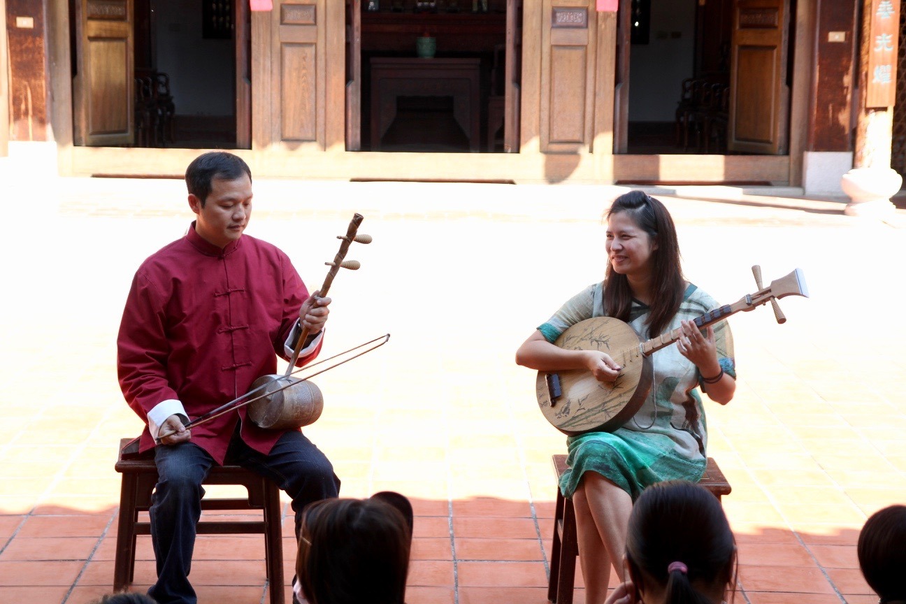 2.示範唸歌口白、月琴操作,並讓學童體驗說口白及月琴彈奏技巧。