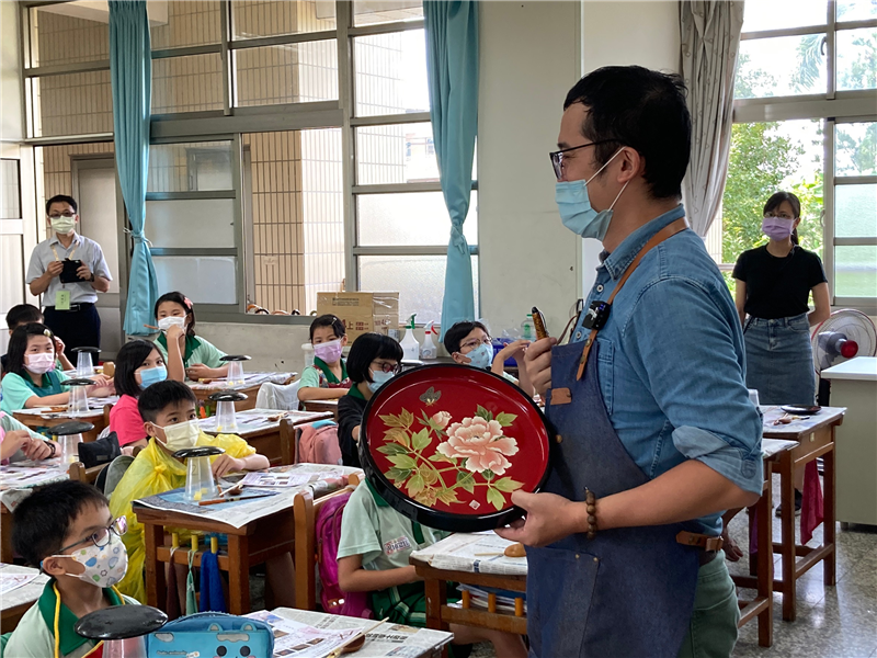 (1) 講師講解:搭配講義文字、觀看照片等PPT教學及觸摸漆器實體,讓小朋友認識豐原在地傳統工藝-漆藝,增加對在地文化的認同與歸屬感,並以問答方式加深印象,讓小朋友在經過這樣的教學過程,進而產生高度的情感與熱情去學習,並持續使用。