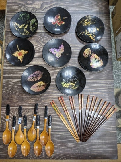 (2) 漆藝創作:讓小朋友由發想在自己的餐具上創作,從做自己的餐具開始,學習入門漆藝技法完成構圖,動手完成作品後引導小朋友思考藝術結合生活的模式,進而產生高度的興趣與喜愛感;當小朋友使用著自己手作的天然漆餐具時,周遭的家人與夥伴因其天然健康與美觀的天然漆餐具,產生共同使用天然漆餐具的意願,影響越來越多人都來自己動手做自己的天然漆餐具,也創造高度活動的永續性與工藝美學推廣。