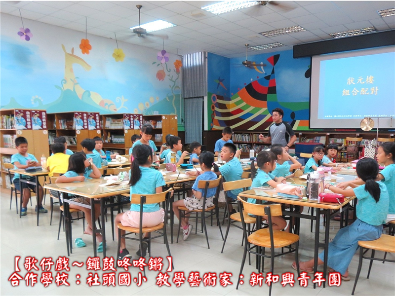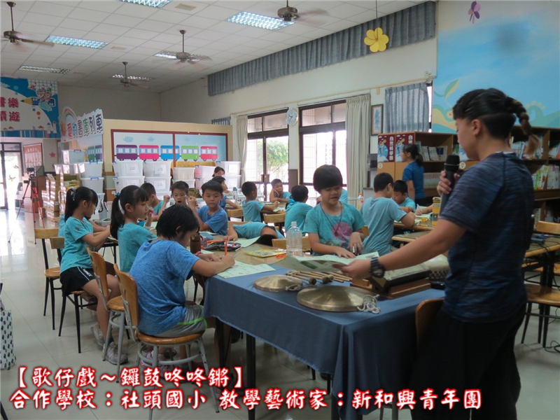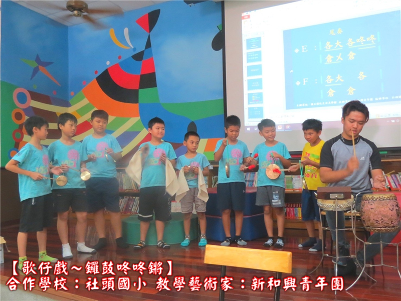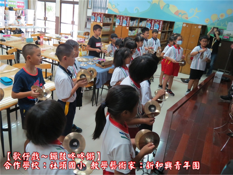 藉淺顯的簡介歌仔戲鑼鼓,創作有趣的【歌仔戲~鑼鼓咚咚嗆】課程,透過歌仔戲鑼鼓體驗課程認識與實作,認識歌仔戲鑼鼓與其他戲曲鑼鼓的差異性,鑼鼓是歌仔戲中非常重要的一環,運用初階的鑼鼓經進行教學。並且加入歌仔戲常見的曲調,如:家喻戶曉的綜藝節目【鐵獅玉玲瓏】最常使用的狀元樓,藉由電視綜藝節目進而使學生引發學習動機, 3.在團隊的教學引導下,學生能了解鑼鼓與戲曲中的奧妙,進行分組學習及演出,透過歌仔戲鑼鈸藝術形式,培養學生具備音樂藝術的感知,經由鑼鈸樂器DIY實作體驗能習得與他人協調、分工,共同合作完成一件事。