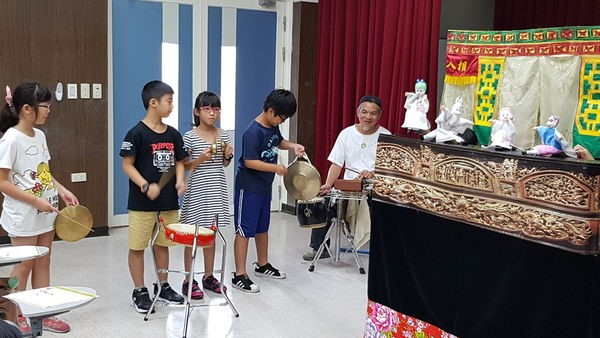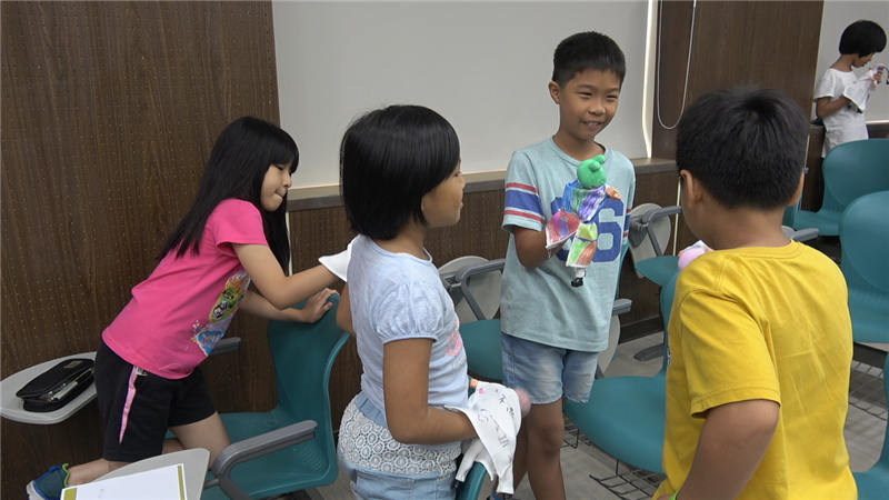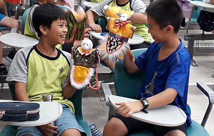 啟發學生對戲劇的創作力,小朋友用自己彩繪的布袋戲創作分組說故事。